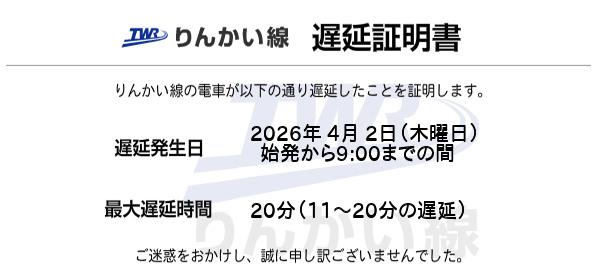 ・当証明書は、りんかい線の電車の遅延のみを証明するものであり、遅延により生ずる損害等を賠償することを証明するものではありません。
